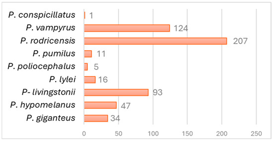 As shown in Figure 2, the species with the highest representation are the Rodrigues flying fox (Pteropus rodricensis, n = 207), the large flying fox (P. vampyrus, n = 124), and the Comoro flying fox (P. livingstonii, n = 93).