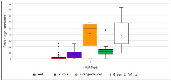 Percentage of fruit per color group consumed by flying foxes in the participating parks (x: mean, •: outliers).