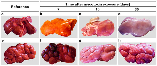 Characteristic morphological alterations in the liver and kidney. (a) Liver without gross lesions and with characteristic coloration. Nonexposed group. (b) Liver with yellowish discoloration and friable consistency. (c) Liver with multifocal hemorrhages and friable consistency. (d) Liver with pale discoloration and hemorrhagic foci. (e) Kidney without gross lesions and with characteristic appearance. (f) Hemorrhagic kidney. (g) Kidney with mottled appearance and firm consistency. (h) Multiple white-gray foci in the kidney.
