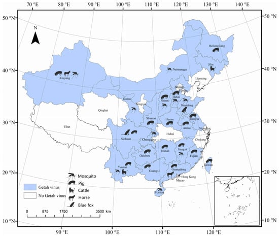 - Li, B.; Wang, H.Y.; Liang, G.D. Getah Virus (Alphavirus): An emerging, spreading Zoonotic virus. Pathogens 2022, 11, 945. [Google Scholar] [CrossRef] [PubMed]