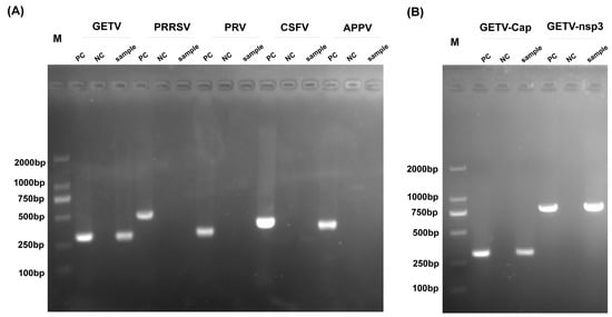 - Lan, J.H.; Fang, M.T.; Duan, L.L.; Liu, Z.; Wang, G.G.; Wu, Q.; Ke, F.; Huang, D.Y.; Ye, Y.; Wan, G.; et al. Novel porcine getah virus from diarrheal piglets in Jiangxi province, China: Prevalence, genome sequence, and pathogenicity. Animals 2024, 14, 2980. [Google Scholar] [CrossRef]