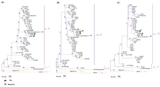- Pan, J.H.; Zhang, H.Q.; Chen, X.Q.; Zeng, M.Y.; Han, H.; Guo, Y.J.; Li, J.M.; Luo, S.C.; Yan, G.Z.; Chen, S.N.; et al. Evolutionary characterization and pathogenicity of Getah virus from pigs in Guangdong Province of China. Arch. Virol. 2023, 168, 258. [Google Scholar] [CrossRef] [PubMed]