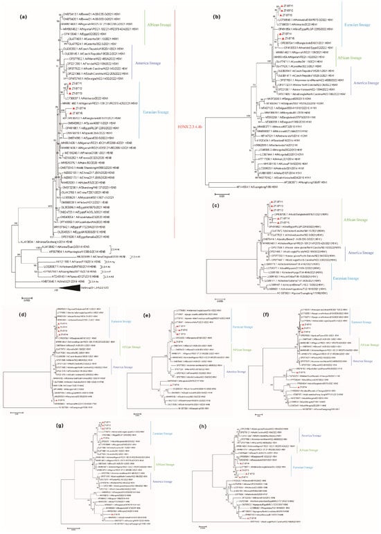 Nucleotide sequence analysis of the complete HA gene showed that the five H5N1 viruses belonged to clade 2.3.4.4b and clustered with H5N1 viruses previously isolated from Africa and Asia. Most H5 avian influenza viruses (AIVs) identified during 2020–2022 were in that clade, while H5N8 was the dominant subtype during 2019–2021, and H5N1 strains emerged in October 2020 and increased from that point on. Three isolates formed a cluster with H5N1 variants from Hokkaido, Japan. In contrast, the other two isolates clustered with the H5N1 virus from Bangladesh (Figure 1a), suggesting that the same virus was introduced in different countries. The phylogenetic analysis showed that except for the M gene belonging to the African lineage (Figure 1c), all other genes belong to the Eurasian lineage (Figure 1b,d–h), suggesting the possibility of genome recombination in the avian influenza virus.