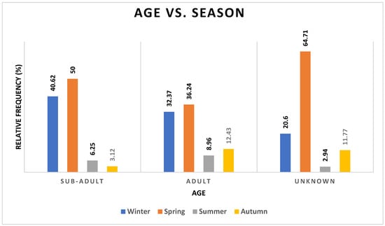 Adults (80%) comprised the majority of admissions overall compared to subadults (8%) and unknown (8%). Age did not appear to be related to any other category, including seasonality (p = 0.1655, odds ratio = 2.63) (Figure 1, Supplementary Materials Table S3).