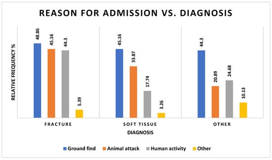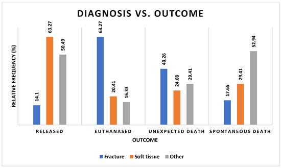 Diagnosis was also a very strong predictor of outcome, regardless of whether it was compared only by result of death or discharge or by manner of death or discharge (Figure 6, Supplementary Materials Table S8) (χ2 = 60.39, df = 2, p < 0.0001). Euthanasia was a more frequent outcome for fractures but was less frequent in soft tissue injuries, which had the highest relative frequency for release. ‘Other’ causes of admission also more frequently resulted in release.