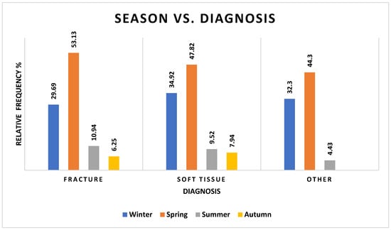 There was a statistically significant component of seasonality in the final diagnosis (χ2 = 17.94, df = 6, p = 0.0064). Admissions for traumatic injuries (fractures and soft tissue) in winter and spring were quite close to what was expected (i.e., more common), with fewer fractures and soft tissue injuries in autumn than expected, and more diagnoses categorized as “other” in autumn than expected (Figure 4 and Supplementary Materials Table S6).