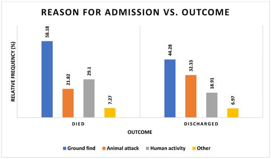 The most common reason for admission was ‘ground find’ (45.87%), followed by ‘animal attack’ (26.21%) and ‘human activity’ (21.35%) (Supplementary Materials Table S4).