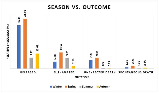There was a close, but not significant, association between season and outcome (Figure 7, Supplementary Materials Table S9).