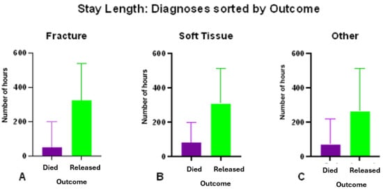 Mean stay lengths of barn owls admitted to CWH sorted into diagnoses of (A) fracture, (B) soft tissue, and (C) other injuries. Within diagnoses, lengths of stay are sorted by outcomes.