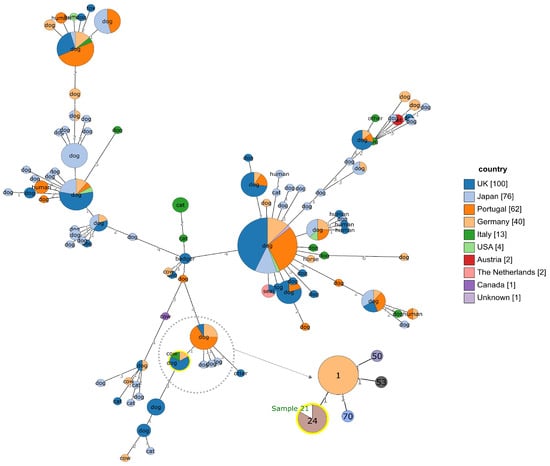 Minimum spanning tree for S. canis isolates, as generated by PubMLST GrapeTree and BURST tools. Main tree: nodes are colored according to geographical origin of the isolate; common name of host species within each node; integer numbers on branches: number of different 7-gene MLST alleles between nodes. Tree extract on the lower right side: nodes with 1-allele difference with the ST24 node, in which isolate from sample 21 is placed. Relevant node is evidenced in yellow.