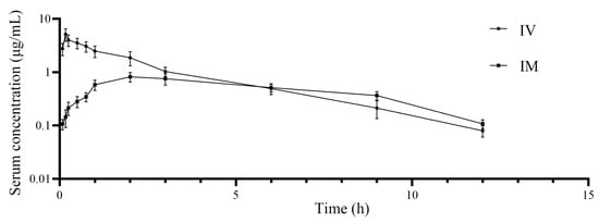 Figure 2 demonstrates the curves depicting the relationship between time and cefquinome concentration in foals after IV or IM administration. Table 1 provides a summary of the PK parameters of cefquinome in the foals. After IV administration, cefquinome exhibited a shorter T1/2β (2.35 h) compared to IM administration (4.16 h). The AUC0–last was higher for IV administration (12.33 μg·h/mL) than for IM administration (5.41 μg·h/mL). Additionally, the MRT0–last was shorter for IV administration (2.67 h) compared to IM administration (4.92 h). The CL was also lower for IV administration (0.09 L/h/kg) than for IM administration (0.15 L/h/kg). The F of cefquinome after IM administration was 43.86%.