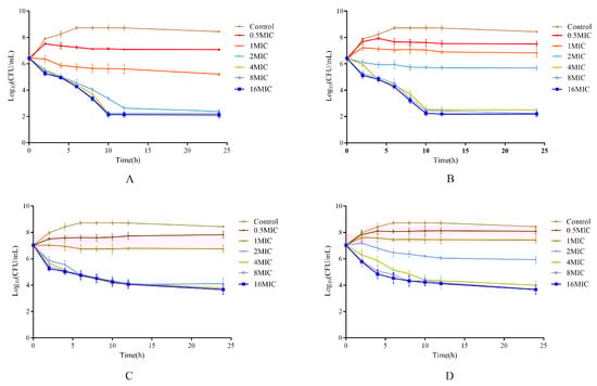 Bacterial cultures in the stationary phase were mixed with 10 mL of MHB and foal serum, and the mixture was diluted to concentrations of 106 CFU/mL and 107 CFU/mL. Subsequently, cefquinome at different concentrations (0×, 0.5×, 1×, 2×, 4×, 8×, and 16× MIC) was introduced into the bacterial suspensions. Bacterial populations were evaluated after 1, 3, 6, 9, 12, and 24 h. Following a series of 10-fold dilutions, the samples were added onto trypticase soy agar (TSA) plates and incubated at 37 °C for 18–20 h. The minimum detection limit was determined to be 200 CFU/mL.