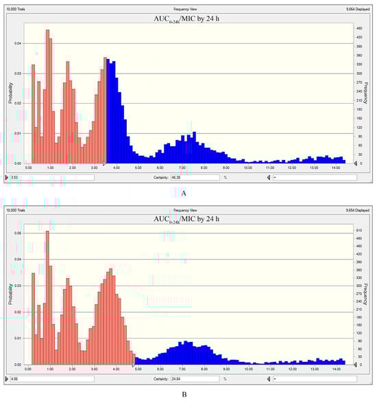 Monte Carlo simulation results. (A) TAR for achieving the PK/PD index targets associated with bactericidal effect. (B) TAR for achieving the PK/PD index targets associated with bacterial elimination. Orange indicates that the target is attained, while blue indicates that the target is not attained.