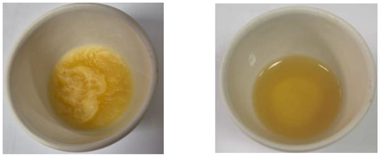 Black soldier fly larvae fat (solid form at ambient temperature (23–25 °C) on the left; liquid form melted by heating on the right).