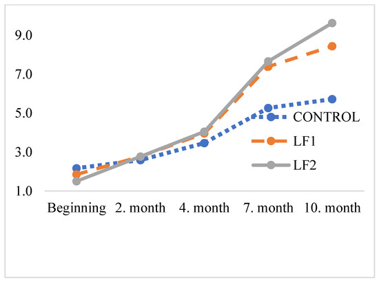 The results of MDA levels of 0, 2, 4, 7, and 10 months after storage of the foods are presented in Table 8, and corresponding curves are shown in Figure 2. Similar oxidation values were observed in dog foods containing poultry fat and BSFL fat throughout the 10-month storage period.