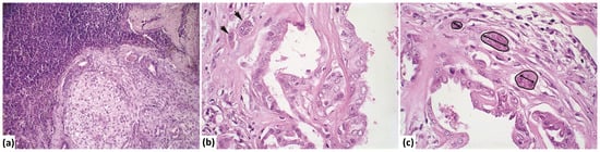 Photomicrograph of mixed-type carcinoma with metastasis. (a) Lymph node showing proliferation of atypical epithelial cells with a myxoid matrix partially replacing the lymphoid parenchyma (H&E stain, 20× magnification). (b) Invasion area (indicated by an arrow) with atypical epithelial cells infiltrating the stroma of the mixed-type carcinoma (H&E stain, 60× magnification). (c) Measurement of the invasion area, perimeter, number of invasion foci, and length (longest diameter) within the stroma of the mixed-type carcinoma (marked in black) (H&E stain, 60× magnification).
