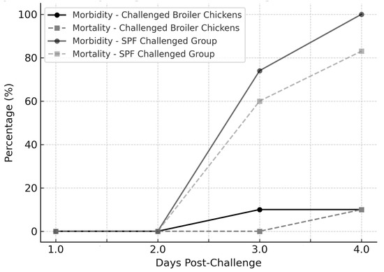 Morbidity—Challenged Broiler Chickens (●, black solid line): Clinical signs appeared on Day 3 post-challenge and remained stable at 10%.