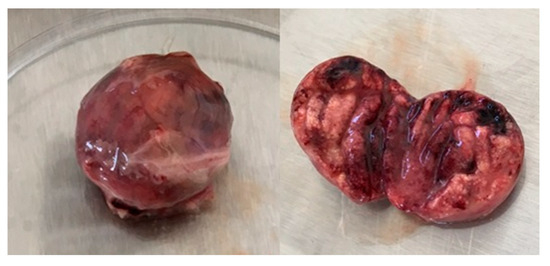 Bursa of Fabricius from SPF chickens challenged with the Moroccan vvIBDV strain at 3 days post-challenge (dpc). The left image shows a characteristic black cherry discoloration, indicative of severe hemorrhagic lesions. The right image presents a sagittal section of the bursa of Fabricius, revealing internal hemorrhage, edema, and swelling, which are hallmark lesions associated with vvIBDV infection.