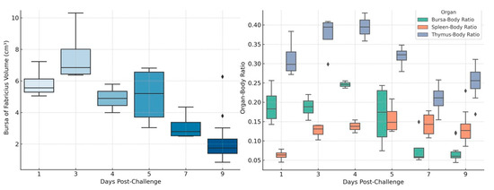 The results showed a pronounced reduction in TBR in challenged broiler chickens (G1), suggesting thymic atrophy, whereas in control chickens (G2), the TBR increased (Figure 3 Right).