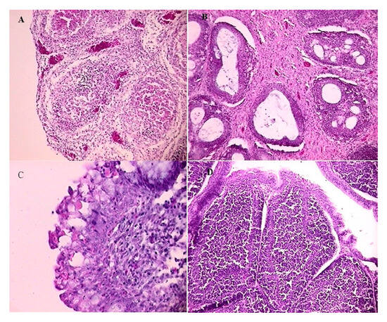 Histopathological changes in the bursa of Fabricius at different dpc in challenged and control broiler chickens. (A) At 4 dpc: acute inflammation of the tunica mucosa, with severe heterophil infiltration, lymphoid depletion of follicles, and intrafollicular cysts filled with necrotic debris (lesion score: 3). H&E, x16. (B) At 9 dpc: severe fibroplasia of the stroma, extensive lymphoid depletion, and metaplasia of the follicular reticular epithelium. The follicles contain large cysts filled with proteinaceous fluid (lesion score: 4). H&E, x16. (C) At 9 dpc: the apex of a plica, showing severe hyperplasia of the lining epithelium and the presence of multiple cysts (lesion score: 5). H&E, x40. (D) The control broiler group (G2): normal bursal follicles with no histopathological lesions (lesion score: 0). H&E, x16.