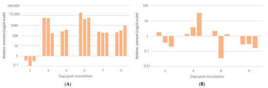 Relative quantification of the vvIBDV viral load in challenged broiler chickens (G1). (A) The viral load in the bursa of Fabricius: low at 1 dpc, and increasing to a peak at 3 and 5 dpc (Ct = 11.8), followed by a gradual decline until 9 dpc (Ct = 29.5). (B) Viral excretion in cloacal swabs: initially low (Ct = 29.3 at 1 dpc), and reaching a peak at 4 dpc (Ct = 21), then gradually decreasing by 9 dpc (Ct = 28.7).