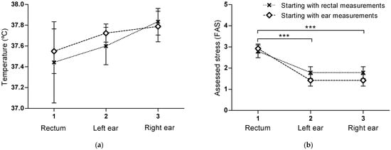 Temperature (a) and assessed stress (FAS) (b). Mean values for the different locations (rectum, left, and right ear) are marked with a star (cats starting with rectal measurements) and a rectangle (cats starting with ear measurements) (a,b). The bars represent SEM. The assessed temperatures were not affected by the starting order of the two methods (p = 0.10) (a). The assessed stress (FAS) was not affected by the starting order (p = 0.16), and the FAS was significantly higher when cats were measured rectally than in the ears (*** p < 0.001) (b). Number of cats, n = 25.