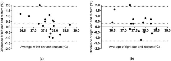 To assess the agreement between tympanic and rectal temperatures, Bland–Altman analyses and plots were used. Bland–Altman analyses can be used to calculate the agreement between two methods (in this case, ear temperature minus rectal temperature), and the difference between the methods is plotted against the average of both methods []. Results are presented as mean bias ± SD and the 95% limits of agreement. Joint Bland–Altman analyses and plots were applied to the non-clinical sample with the two starting groups pooled, but for the right and left ear separately. In the clinical sample, all three temperature groups were analyzed together as well as separately. Potential proportional bias in the non-clinical sample was evaluated by visual inspection of the joint Bland–Altman plots, and Pearson correlation analyses were conducted on the difference versus the average of the two methods to analyze the relationships []. A joint Bland–Altman plot for all three temperature groups pooled in the clinical sample was created for the evaluation of potential proportional bias, and the difference versus the average was analyzed by Pearson correlation analysis. The threshold for statistical significance was set to p < 0.05 in all analyses in the study.