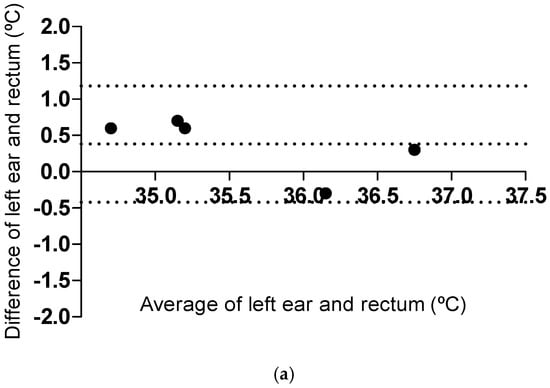 In previous research on the use of tympanic thermometers in pets, a variety of different temperature differences have been considered acceptable compared to the rectal temperature. Two previous studies on in-ear measurements in cats set the acceptable difference at a maximum of 0.5 °C [,], and another study of anesthetized cats set the acceptable difference at 0.2 °C []. A study measuring dogs with hypothermia, normothermia, and hyperthermia found that the maximum acceptable difference between methods was 0.3 °C []. It is thus evident that different studies have considered different temperature differences between methods acceptable in a clinical situation. Those previous studies [,,,] evaluated temperature data that were presented as median and range, confidence intervals, mean bias and limits of agreement, complicating comparisons between studies.