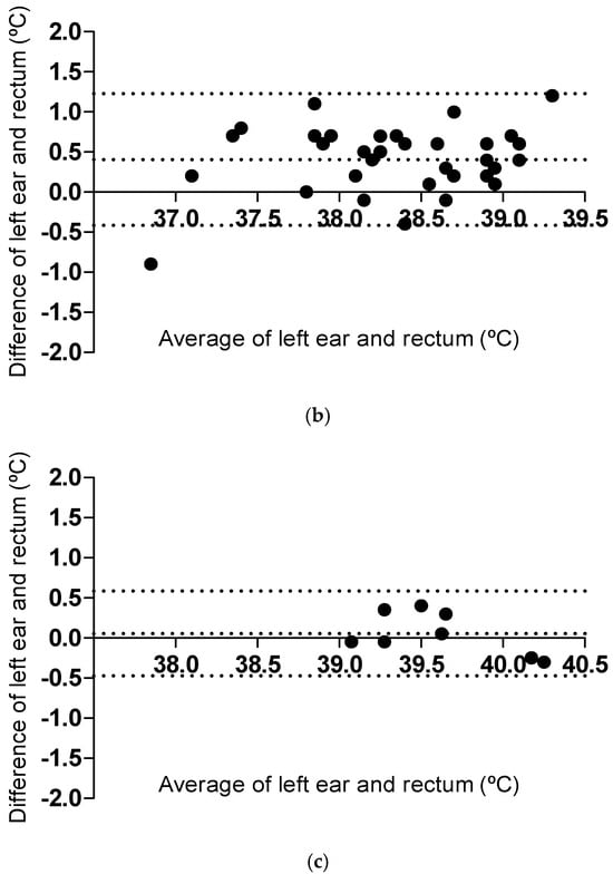 Bland–Altman plots of left ear and rectal temperatures in (a) hypothermic cats (<36.7 °C, n = 5), (b) normothermic cats (36.7–38.9 °C, n = 34), and (c) hyperthermic cats (>38.9 °C, n = 8). Temperatures were assessed by a tympanic thermometer and a rectal thermometer, and cats were classified according to their rectal temperature. The difference between left ear minus rectal temperatures (y-axis) and the average of left ear and rectal temperatures (x-axis) are shown. The central dotted lines represent the mean bias, and the peripheral dotted lines represent the upper and lower 95% limits of agreement.
