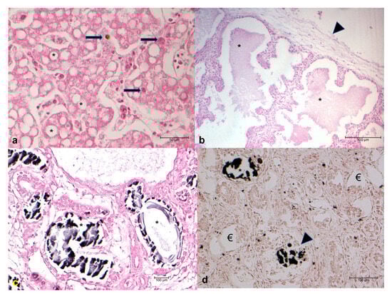 Histological examination of gonads and the central nervous system was not significant due to the heavy degree of autolysis. Stomach and intestine did not show any alterations. In 1/43 (2.3%) cases, a focal non-suppurative infiltration of the heart was observed. An increasing number of melanomacrophages (8/43 cases; 18.6%), hemorrhages (3/43 cases; 7.0%), and vacuolar degeneration (43/43 cases; 100%—Figure 1a) were present in the liver (Figure 1a). Oedema was observed in the lungs of 6/43 (14%) cases (Figure 1b), and 25/43 (58.1%) animals showed glomerular and tubular oxalosis, identified by von Kossa staining as calcium carbonate crystals, involving more than half of the renal parenchyma in 19 out of 25 (76%) animals (Figure 1c,d).