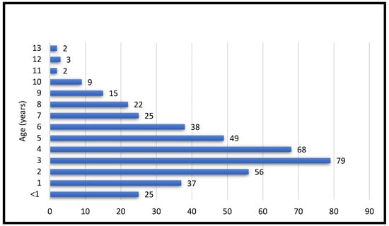 Dog breeds present in the studied population were the Akita Inu (n = 6), American Staffordshire Terrier (n = 12), Beagle (n = 15), Bichon Frise (n = 15), Bichon Havanese (n = 8), Maltese Bichon (n = 17), Boxer (n = 15), German Short-Haired Pointer (n = 4), English Bulldog (n = 9), French Bulldog (n = 30), Bullmastiff (n = 4), Bullterrier (n = 5), Poodle (n = 11), Chihuahua (n = 5), Chow-Chow (n = 2), German Shepherd (n = 46), Cocker Spaniel (n = 3), Golden Retriever (n = 16), Husky (n = 8), Labrador Retriever (n = 36), Pug (n = 11), Pekinese (n = 12), Pomeranian (n = 7), Dwarf Schnauzer (n = 6), Shar-Pei (n = 13), Shih-Tzu (n = 20), Dachshund (n = 7), Viszla (n = 9), West Highland White Terrier (n = 19), Yorkshire Terrier (n = 25), and mix breeds (n = 34). The age distribution of the canine patients ranged widely, with the youngest animals being six months old and the oldest 13 years old, with an average of 4.1 years (Figure 1).