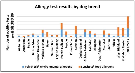 A comparison between the dogs with significant sensitivity reactions to the Polycheck® and Sensitest® tests [15], categorized by breed, revealed that while some breeds may have a genetic tendency toward atopic allergies, in most cases, they are also prone to food-related sensitivities (Figure 3).