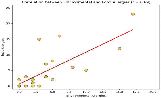 The Pearson correlation coefficient between environmental allergens (Polycheck®) and food allergens (Sensitest®) was p < 0.05. This indicates a strong positive linear relationship between the two variables. The linear regression analysis revealed that for each additional environmental allergy, the number of food allergies was expected to increase by 0.97 on average (Figure 4).