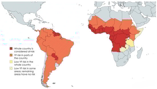 Countries considered at-risk for YFV transmission. The countries indicated on this map are defined as of November 2022 by the World Health Organization (https://www.who.int/publications/m/item/countries-with-risk-of-yellow-fever-transmission-and-countries-requiring-yellow-fever-vaccination-(november-2022), accessed on 20 February 2025) as areas where YF has been reported currently or in the past and vectors and animal reservoirs currently exist.