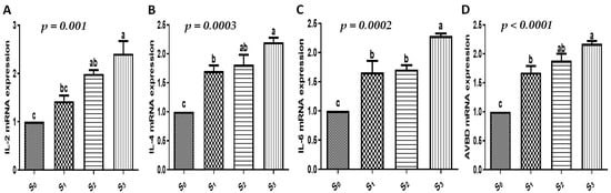 | IL-10 (Pg/mL) | 28 c ± 1.83 | 35.25 bc ± 2.81 | 43.75 ab ± 2.84 | 51.50 a ± 3.88 | =0.001 |