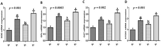 | SOD (U/mL) | 40.84 c ± 1.87 | 57.30 b ± 1.96 | 51.09 b ± 2.68 | 70.55 a ± 2.29 | <0.0001 |