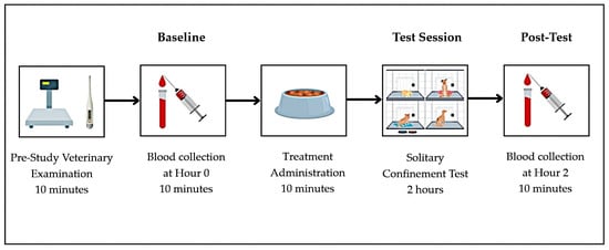 On days 1, 7, and 14, prior to the treatment administrations, all dogs were weighed, had their rectal temperature recorded, and underwent a pre-treatment veterinary examination. Pre-treatment blood sampling was then performed to establish baseline cortisol levels and hematological parameters (Hour 0). After that, at 08:00–08:30, the assigned treatment was administered by shelter staff. Immediately after treatment administration, each dog was placed individually into a confinement cage sized 118 × 79 × 100 cm, isolated from both visual and physical contact with other dogs, for a period of 2 h. This controlled isolation served as the acute stressor for the study. At the end of the 2-h confinement period (Hour 2), post-stress blood samples were collected, and the dogs were released to roam freely within the shelter.