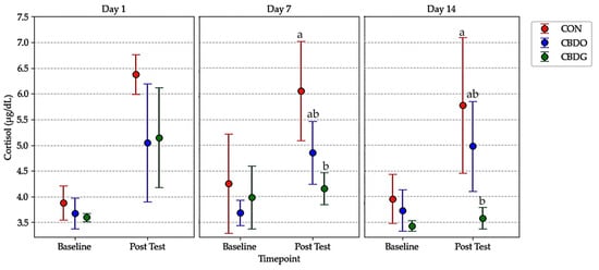 Mean serum cortisol levels (µg/dL) at baseline and post-test in dogs from the control group (CON), CBD oil group (CBDO), and CBD gel group (CBDG) at Day 1, Day 7, and Day 14. Data are presented as mean ± standard deviation (SD). Significant differences between groups are indicated by different superscript letters (p < 0.05), based on repeated measures ANOVA followed by Bonferroni post-hoc test.