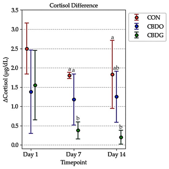 Changes in serum cortisol levels (ΔCortisol, µg/dL) in dogs from the control group (CON), CBD oil group (CBDO), and CBD gel group (CBDG) at Day 1, Day 7, and Day 14. Data are presented as mean ± standard deviation (SD). Significant differences between groups are indicated by different superscript letters (p < 0.05), based on repeated measures ANOVA followed by Bonferroni post-hoc test.