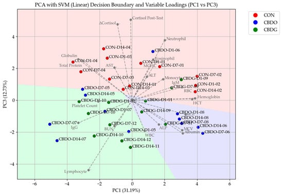 To evaluate multivariate patterns across hematological and biochemical parameters, Principal Component Analysis (PCA) was performed using combined hematological and biochemical data from all 36 blood samples collected from the 12 dogs across the three sampling days (days 1, 7, and 14). Prior to PCA, all parameters were normalized using z-score normalization, which standardizes each variable to have a mean of 0 and a standard deviation of 1, to ensure that differences in scale between variables did not unduly influence the analysis. PCA was conducted to explore the overall pattern of blood parameter variation across treatment groups and time points and to evaluate potential clustering patterns related to CBD administration. Linear Support Vector Machine (SVM) classifiers were applied to the principal components to visualize group separation boundaries within the PCA plot. All multivariate analyses were performed using scikit-learn (v1.3), and data visualization was carried out using Matplotlib (v3.7.1) in Python.