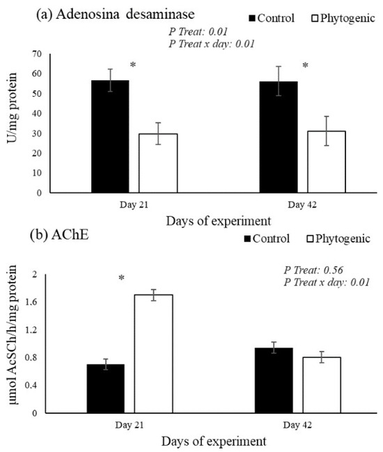 The results in lymphocytes are shown in Figure 1. The enzymatic activity of ADA in lymphocytes was lower in the Phytogenic group on days 21 and 42 compared to the control, with treatment effects (p ≤ 0.01) and treatment versus day interaction (p ≤ 0.01). The activity of AChE in lymphocytes was higher in the cows fed with the phytogenic on day 21 (p ≤ 0.01) compared to the control.
