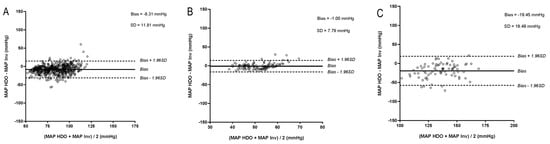 (HDO): Bland–Altman plots of agreement between invasively measured mean arterial blood pressure (iMAP) and mean arterial blood pressure obtained by high-definition oscillometry (MAP HDO) at (A) normotension (iMAP 60–120 mmHg), (B) hypotension (iMAP < 60 mmHg), (C) hypertension (iMAP > 120 mmHg, (D) SVRI in reference (1523–1928 dynes/s/cm5/m2), (E) SVRI low (<1523 dynes/s/cm5/m2), (F) SVRI high (>1928 dynes/s/cm5/m2). The solid line indicates the mean bias and the dashed lines the upper and lower limits of agreement.