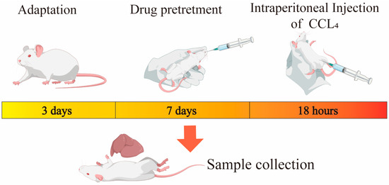 A total of 24 SPF-grade male KM mice (purchased from Southwest Medical University) were randomly assigned into four groups: the control group (CON), model group (CCL4), high-dose EHW group (EHW-H), and low-dose EHW group (EHW-L), with 6 mice in each group. After 3 d of acclimatization, all mice were treated with daily oral gavage for 7 consecutive days at a dose of 0.1 mL/10 g of EHW decoction. The high-dose group received EHW at 4 g/kg, and the low-dose group received 2 g/kg. The CON and CCL4 groups were given an equivalent volume of sterile water. One hour after the final dose, the mice were injected intraperitoneally with CCL4 solution (0.1% CCL4 in olive oil) at a dose of 0.1 mL/10 g. Analogously, the CON group received an equivalent volume of olive oil. Eighteen hours later, the mice were gavaged once more and then anesthetized for blood collection from the ocular sinus. Finally, the mice were euthanized via cervical dislocation, and their liver tissues were harvested. Part of the liver was fixed in 4% paraformaldehyde, and another portion was rapidly frozen in liquid nitrogen and stored at −80 °C for long-term preservation. The experimental procedure and treatment flow was created with the BioGDP website (https://biogdp.com/ (accessed on 17 October 2024)) [25], as shown in Figure 1. All animal experiments were conducted in accordance with the guidelines approved by the Ethics Committee of Southwest University for Animal Welfare (Ethics No. LAC2024-1-0346).
