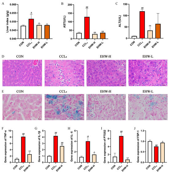 EHW was purchased from Kangyiyin Biotechnology Co., Ltd. (Bozhou, China). CCL4 was obtained from Guangdong Puhui Chemical Technology Co., Ltd. (Shaoguan, China). The reagent kits for aspartate aminotransferase (AST) and alanine aminotransferase (ALT) were purchased from Nanjing Jiancheng Bioengineering Institute (Nanjing, China). Hematoxylin and eosin staining kits were from BKMAM Biology Technology Co., Ltd. (Changde, China), and the Prussian blue staining kit and 2 × Universal Blue SYBR Green qPCR Master Mix were from Wuhan Servicebio Technology Co., Ltd. (Wuhan, China). RNAiso Plus was purchased from TaKaRa Bio Lnc. (Tokyo, Japan), and the All-in-One 5 × RT MasterMix reverse transcription kit was obtained from Applied Biological Materials Inc. (Vancouver, BC, Canada).