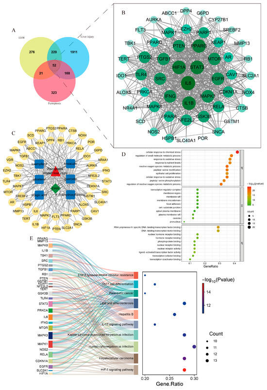 By searching the GeneCards database with the keyword “liver injury” and applying the filtering criterion of having a relevance score > 8, the target information was merged with data from the DisGeNET database. After removing duplicate entries, 2360 disease-related targets for liver injury were identified. In the FerrDb database, 564 ferroptosis-related disease targets were obtained. By intersecting the 578 targets of EHW with the 564 ferroptosis-related targets and the 2360 liver injury-related targets, 52 potential targets for EHW in improving ferroptosis-related liver injury were identified. The Venn diagram illustrating these results is shown in Figure 3A.