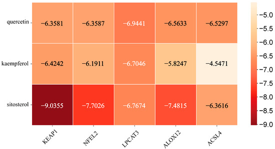 Heatmap of the binding affinity between the key targets related to ferroptosis and liver injury and the active components of EHW.