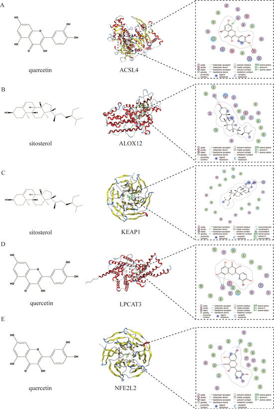 (A) Molecular docking visualization of quercetin and ACSL4. (B) Molecular docking visualization of sitosterol and ALOX12. (C) Molecular docking visualization of sitosterol and KEAP1. (D) Molecular docking visualization of quercetin and LPCAT3. (E) Molecular docking visualization of quercetin and NFE2L2.