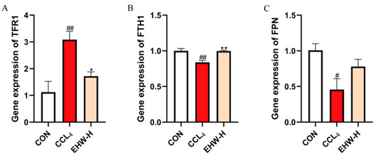 As shown in Figure 7, compared to the CON group, the mRNA expression of TFR1 was significantly elevated in the CCL4 group (p < 0.01), while the mRNA expression of FTH1 was significantly reduced (p < 0.01). Additionally, the mRNA expression level of FPN was significantly decreased (p < 0.05). In contrast, when compared to the CCL4 group, the EHW-H group showed a significant reduction in TFR1 mRNA expression (p < 0.05), while FTH1’s mRNA expression was significantly increased (p < 0.01), and the mRNA expression of FPN exhibited an upward trend.