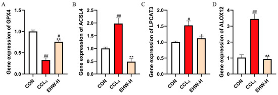 The effect of EHW on gene expression in the PLOOH metabolism pathway. (A) Relative GPX4 mRNA expression. (B) Relative ACSL4 mRNA expression. (C) Relative LPCAT3 mRNA expression. (D) Relative ALOX12 mRNA expression. Note: * indicates a statistically significant difference compared to the CCL4 group, # indicates a statistically significant difference compared to the CON group, * p < 0.05, ** p < 0.01; # p < 0.05, ## p < 0.01.