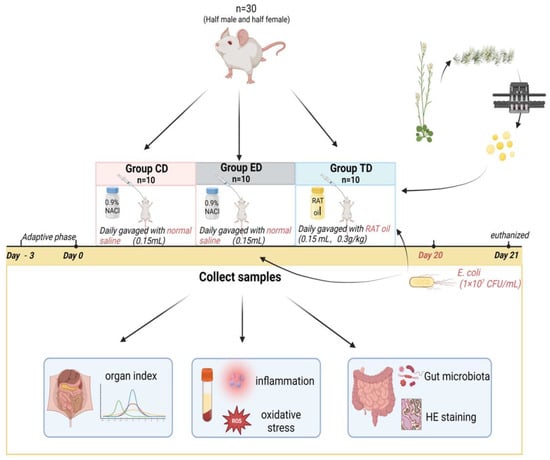 After three days of acclimatization, the mice were randomly divided into three groups: the control group (CD), the infection group (ED), and the treatment group (TD). ICR mice in the TD were gavaged with APR oil (0.15 mL/kg/day) for 20 days, while those in the CD and ED received an equal volume of normal saline. On the 21st day, the ED and TD were inoculated with multi-drug-resistant E. coli (clinical isolate PP859186, 1 × 10⁷ CFU/mL) derived from diarrheal yak []. The strain’s pathogenicity is attributed to its clinical origin and resistance profile, though serotype-specific markers (e.g., K88/K99) were not characterized. Meanwhile, mice in the CD were administered an equivalent amount of Luria–Bertani nutrient medium (Solarbio Science & Technology Co., Ltd., Beijing, China). Twenty-four hours post-inoculation, all mice were euthanized to collect blood, organs, and intestinal samples. The key parameters, such as body weight, diarrhea rate and mortality, organ index, organ bacterial loads, serum oxidation resistance, inflammation levels, and microbiota composition, were analyzed (Figure 1).